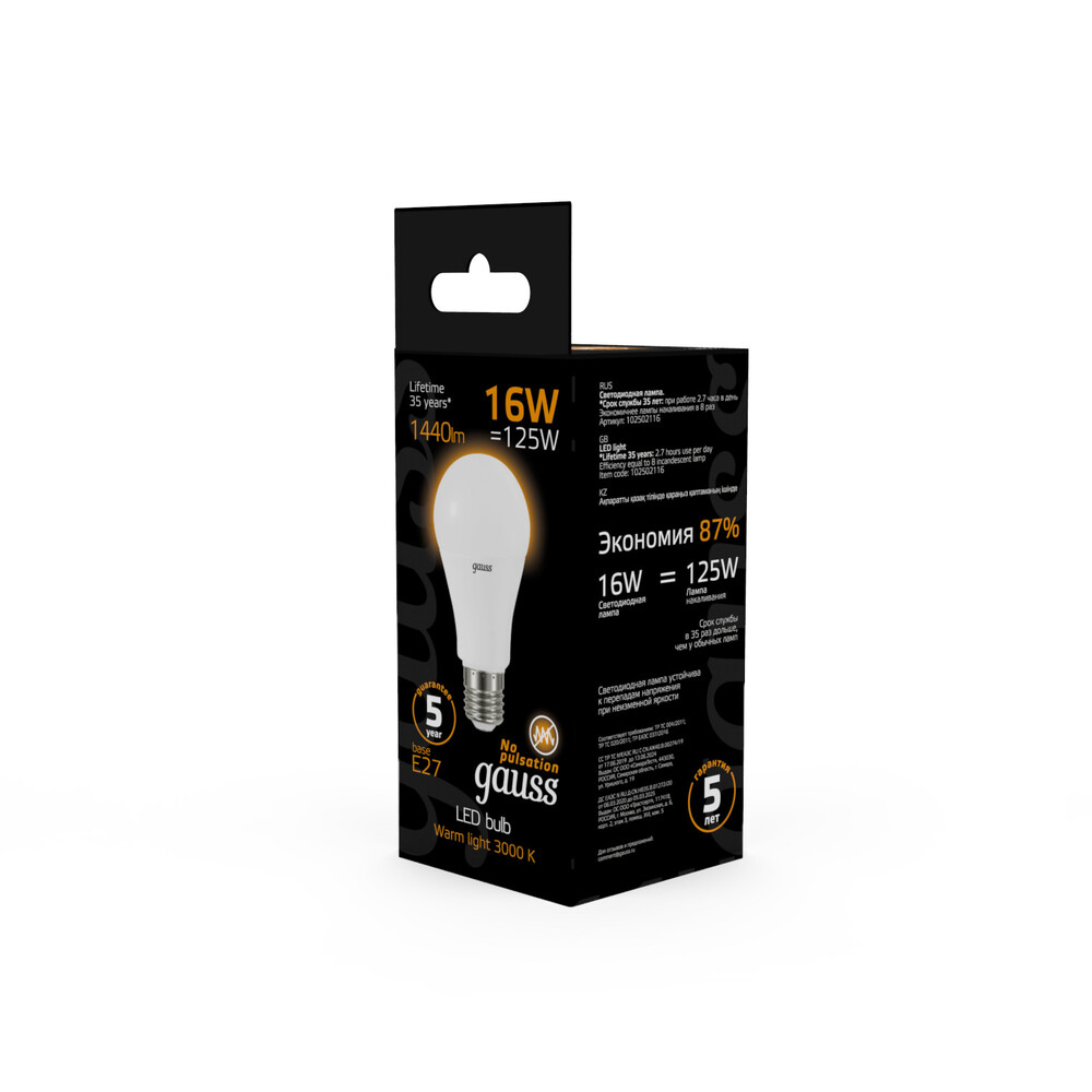 Светодиодная лампа Gauss A60 16W 1380Lm 3000K E27 102502116