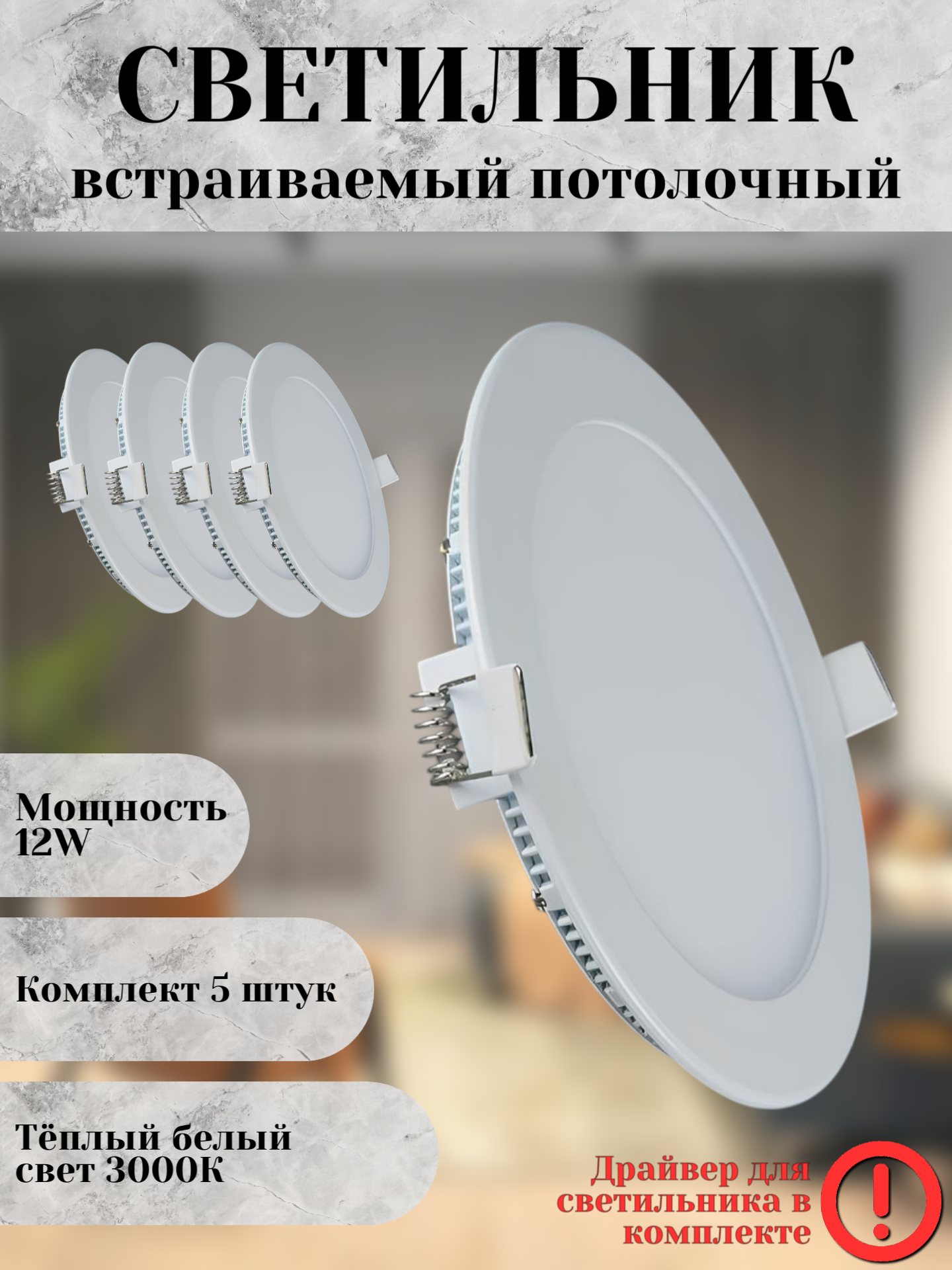 Комплект из 5 круглых светодиодных светильников - эффектное решение для любой комнаты в вашем доме! Светодиодный светильник можно использовать как в качестве основного освещения, так и для создания акцентов в определенных зонах комнаты. Светильник монтируется в подвесные, натяжные потолки, потолки типа "Армстронг" с помощью специальных пружинных креплений. Имеет малую глубину встраивания.